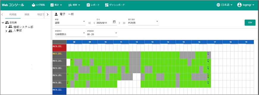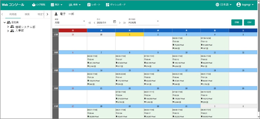 カテゴリ毎のWeb閲覧時間やリムーバブルメディアへの書出し回数などを期間を指定して集計することができます。
